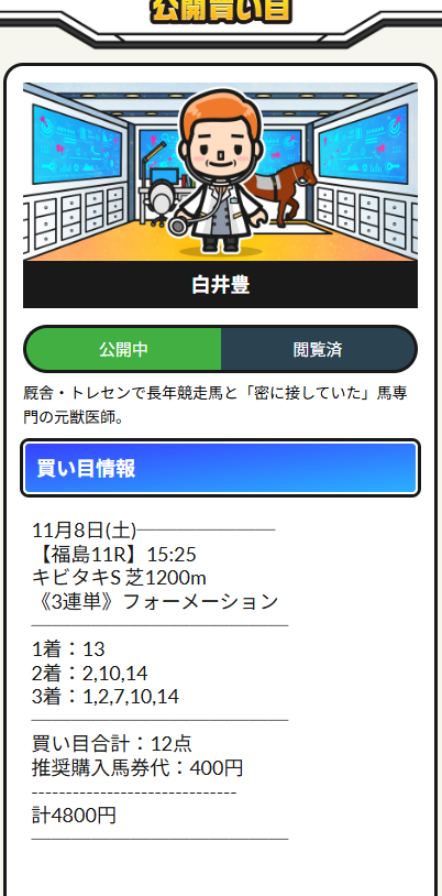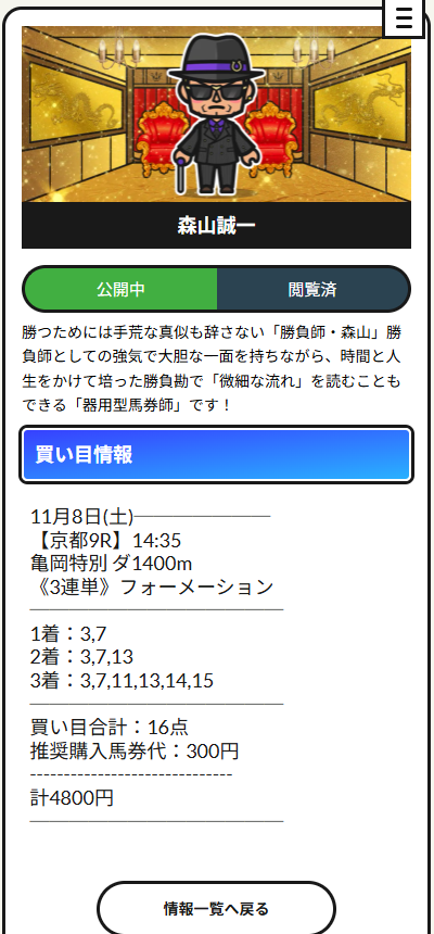 11月8日(土)の京都9Rを、森山誠一さんの有料情報で勝負。