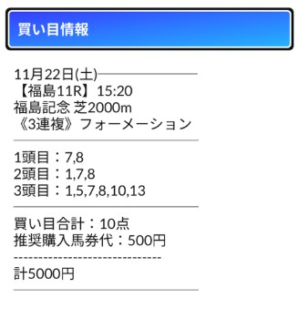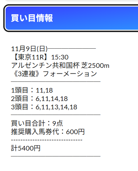 2025年11月9日(日)、東京12Rの三連単9点、1点600円という白井豊さんの有料情報を利用。
