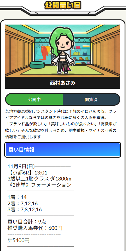 西村あさみさんの9日(日)京都6R・有料情報を購入。